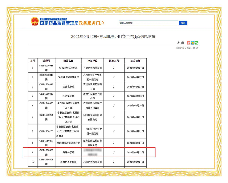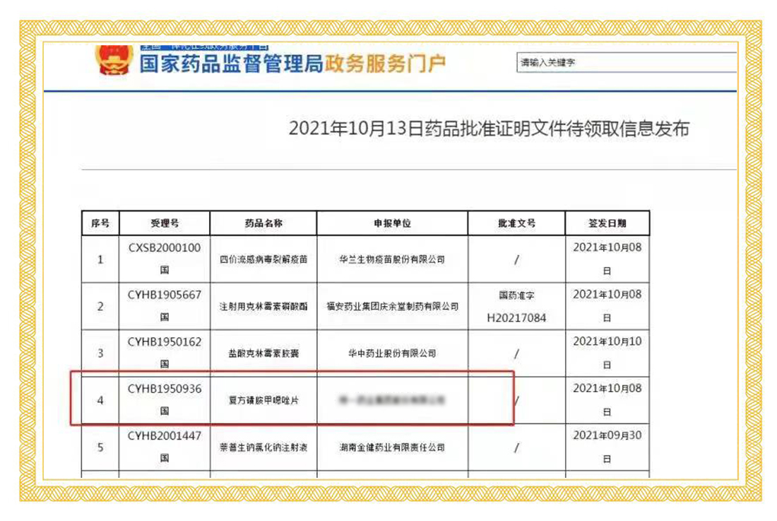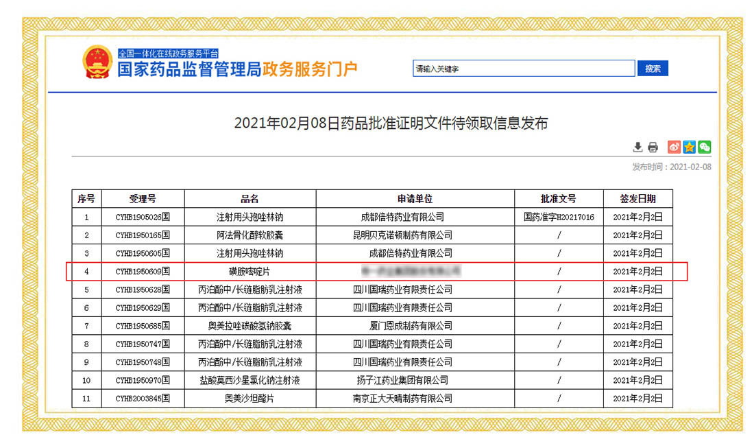 2021年2月2日,國家藥品監(jiān)督管理局正式發(fā)布通知,華威醫(yī)藥接受委托申報(bào)的磺胺嘧啶片正式通過仿制藥質(zhì)量和療效一致性評價(jià)。同時(shí),這也是國內(nèi)首家通過磺胺嘧啶片的企業(yè)。