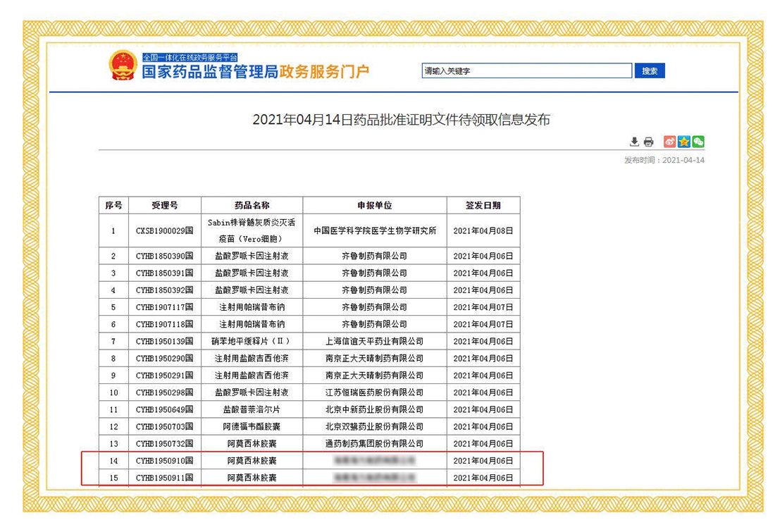 2021年4月6日,國家藥品監(jiān)督管理局正式發(fā)布通知,華威醫(yī)藥接受委托申報(bào)的阿莫西林膠囊(0.25g、0.5g)正式通過仿制藥質(zhì)量和療效一致性評價(jià)。