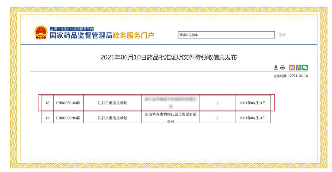 2021年6月4日,國家藥品監(jiān)督管理局正式發(fā)布通知,華威醫(yī)藥接受委托申報(bào)的注射用奧美拉唑鈉正式通過仿制藥質(zhì)量和療效一致性評價(jià)。