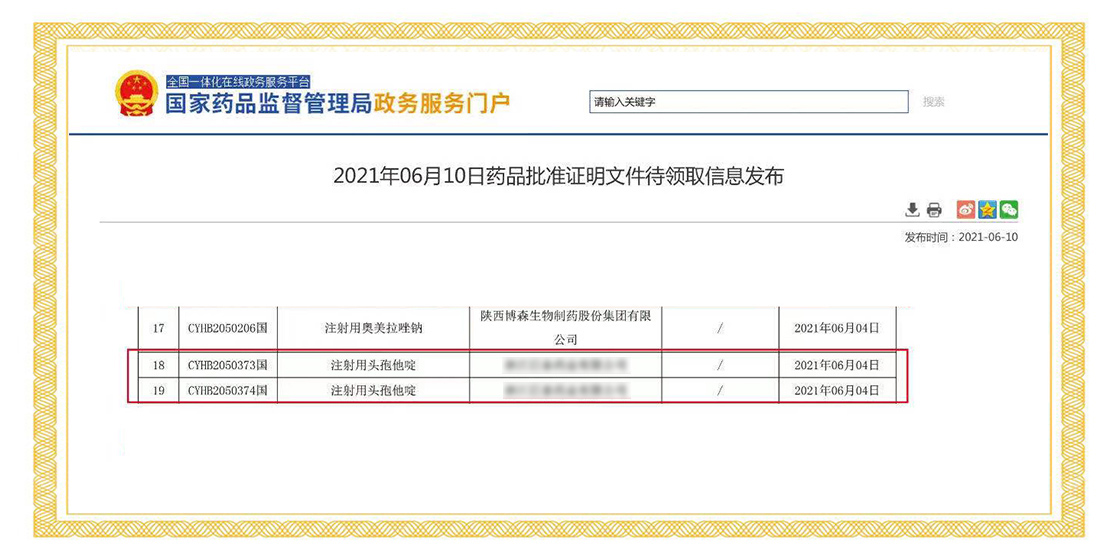 2021年6月4日,國家藥品監(jiān)督管理局正式發(fā)布通知,華威醫(yī)藥接受委托申報(bào)的注射用頭孢他啶(0.5g、1.0g)正式通過仿制藥質(zhì)量和療效一致性評價(jià)。