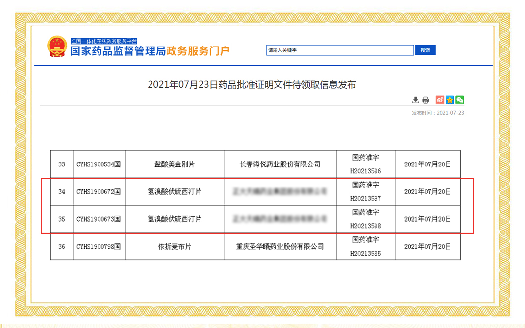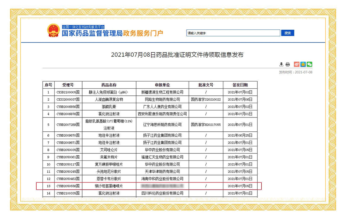 2021年7月5日,國家藥品監(jiān)督管理局正式發(fā)布通知,華威醫(yī)藥接受委托申報(bào)的纈沙坦氫氯噻嗪片項(xiàng)目正式通過仿制藥質(zhì)量和療效一致性評價(jià)。值得關(guān)注的是,這是國內(nèi)第四家通過纈沙坦氫氯噻嗪片的企業(yè)。